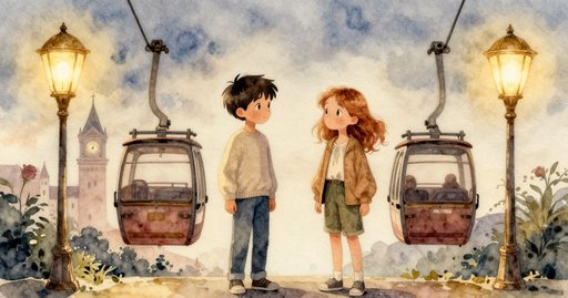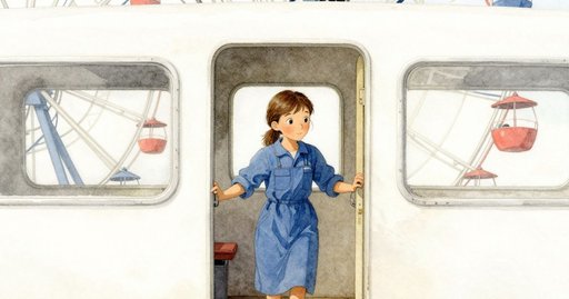 在輪頂,麵粉的溫度仍停在袖口。微風透過車廂頂細孔遷移,掀動紙巾角,把紙杯推到她膝旁直到卡住。指節仍貼在欄杆,她再次審視扣柄;金屬上留下無數乘客隨興敲擊的微痕。若扣柄再鬆點,玻璃就會自行外開;此刻她需決定是否相信鉸鏈。她提起把手,頓一下又放下——一次——測試轉軸。這時才響起細微金屬聲,玻璃緩推,風帶著炸麵香與遠處旋轉木馬的樂段湧入。透過逐漸張開的縫隙,一條椋鳥帶切過橙空,像深色刺繡在亮雲間翻動。地平線變銳;屋脊、天線如清晰鏡頭突顯。
