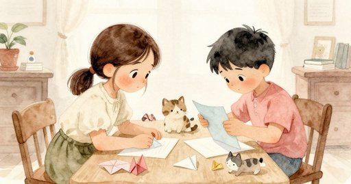 菲奧娜於桌上擺放平衡鶴形紙模型,輕推雪松抽屜,烏利克背景摺紙進行中,室內溫馨寧靜