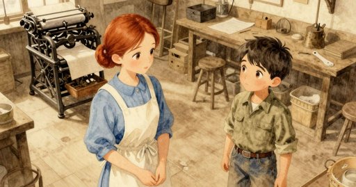 肯特停下,排字尺懸在半行之上。那痕跡不再像足印;他把頁槽傾向燈光,倒映的字母拼出弗農的名字,只因輕觸潮氣才被抬起。原來是未上墨的滾筒輕壓所致,而非陌生腳步。這些鏡像字母讓肯特面臨選擇:抹去一切,還是讓微弱致敬自然乾燥。他微調手勢,食指輕落在痕跡上,彷彿頁槽是塊保護脆弱事物的玻璃。「就留著吧。」弗農低聲說,同時轉動壓框螺釘。他們短短對話沒有儀式,卻蘊含師徒之重;兩位工匠只是共享空間與默契。肯特把頁槽放上晾架,解下圍裙掛帶,門外和暖的午風拂過帶墨指節。