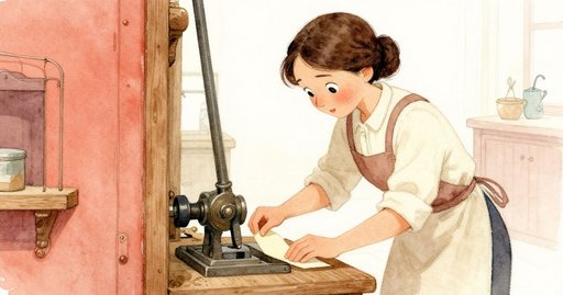 再補一次墨──那個幾乎漫不經心的動作──跨過了未被察覺的臨界。滾筒邊緣的墨不再消失,而是聚成小池;下一拉在排版面留下濕潤嘆息,壓板落在過厚的墨膜上。紙張帶著模糊暈影出來。Ruby 僵住,握把停在半空,肩頭微顫。Mabel 從字櫃抬頭:「慢些。」話只此一句。Ruby 吸氣,把廢頁放到一旁,隨即調整:輕些上墨,壓力減緩,行程縮短,讓滾筒滑過而非衝過。