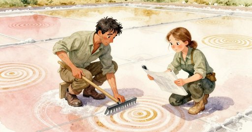 She left the shard where it lay and waded into the nearest pool, guiding the rake’s flat teeth across the water in long, parallel sweeps. Salt flakes shivered, gathered, and caught against the handle’s nicks—small dents that read like the quiet inheritance of many harvests. Warm air rose from the pans, yet a fermented tang clung nearer the channel where yesterday’s brine had thickened overnight. Dana crouched at the far edge and lifted a dripping bucket, calling, “This lane is ready!” before setting it down with a gentle splash. Thea nodded, but her gaze kept drifting to the pale fragment, still balanced between darkness and glare.