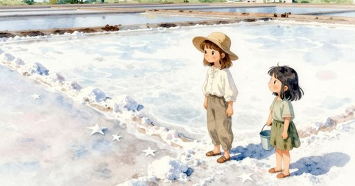陰影涼爽的牆邊斜倚著一把木耙,門外的陽光在鏡面般平靜的鹵水上跳躍。耙子旁,一塊彎曲、如珍珠般蒼白的碎片半在陰影、半在耀眼光芒中閃著光澤。蒂雅調整草帽,踩過脆裂的鹽殼,靴尖碰到那脆弱的碎片便停下。遠處自行車鈴聲清脆地響了兩下,在小屋內低沈的安靜裡分外分明。池塘之外,薄雲向北漂移,而小屋裡的空氣卻恆常靜止,攬住每一塊粗糙木板的涼意。