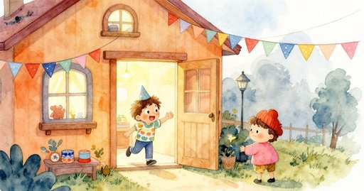 湯姆和艾瑪奔跑著。他們在樹旁搜尋。一扇門突然出現在樹上。他們打開這扇門。神秘的光芒在裡面閃耀。驚喜充滿了他們的心靈。他們從未預料到魔法。魔法在他們周圍飄浮著。喜悅映在每張明亮的臉上。魔法過後,他們綻放微笑。白天以溫柔的愛意劃下句點。最終,他們分享著溫暖的擁抱。他們享用著柔和溫暖的茶。朋友加入了這段快樂的旅程。更多笑容展現出真摯的喜悅。