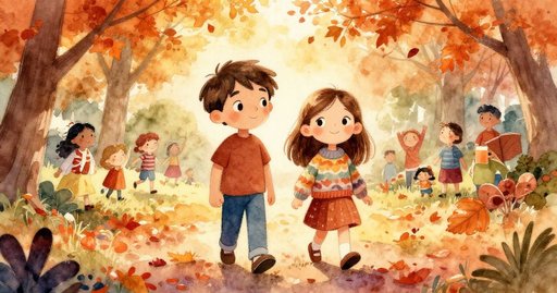 4.樹葉在微風中跳舞,光線透過綠意照耀,湯姆與艾瑪感受到魔法般的溫暖與柔風,充滿詩意。