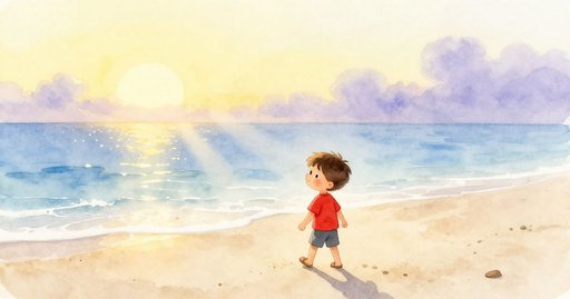 Milo 微笑著在靜謐碼頭邊拾起藍色水手帽,彷彿自然贈予一份珍貴禮物,心中滿是喜悅與溫暖。
