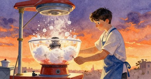 約里克離開碎石小徑,鑽進糖果色的遮棚下。就在鞋底離開礫石的那刻,一杓砂糖傾入旋轉鼓的鋼喉,隱藏的加熱面將晶粒融成液體;液體消失在帶孔的壁後,馬達維持平穩的嗡聲。他聽見細小的嘶響、音高的微變和持續的旋轉,心中產生一個假設:熱加飛旋能把甜味編進空氣。鼓面上方仍空無一物。操作員史黛拉擦拭紙筒,留他獨自面對這台像低垂月亮般發亮的機器。他把雙手放在紙柄上,等待。