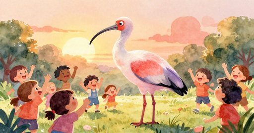 Bird mother expressing gratitude as butterfly and small bird arrive - warm wide shot illustration
