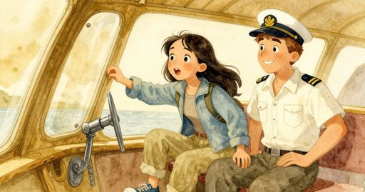 Mia安心地看著章魚輕敲窗戶,艙內充滿明亮光線,她臉上流露出驚奇與滿足,整個場景充滿溫暖喜悅。