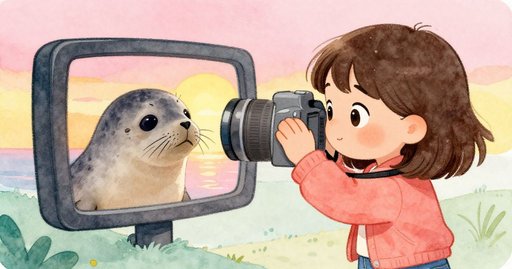2.Mia舉起相機對著圓形窗戶,窗外藍色水族箱中石頭、珊瑚和大章魚靜靜飄移,她目光充滿驚奇。