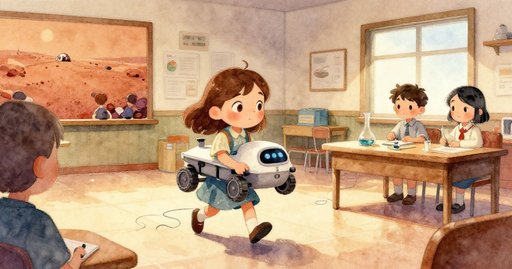 1.米拉在晨光中的學校展覽大廳中走進來,充滿期待和活力,背景裝飾明亮而歡樂。