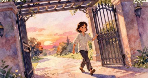 這普通的瑕疵改頭換面:不是損傷,而是季節刻度,每一道弧線都記下樹木對陽光的朝向次數。覆疊的銅線記憶下,杜松被一次又一次轉向,直到樹幹均勻熟成。芙伊挺直身子,肩膀跟著抬起;她的手指停在螺旋上方,又收回,沒有觸碰。光線掠過細痕,再度回來,映出她的停頓。她與奧森對視片刻,選擇了最小的決定:那一圈改天再解。庭院的節拍器恢復──滴、滴、滴、滴──她再次抓起澆水壺。她再度傾斜銅壺,水流穩穩碰上盆緣,沒有半點顫抖。