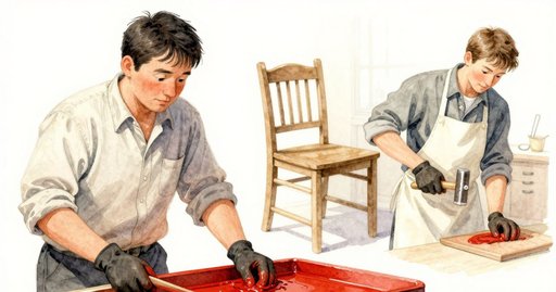 塔姆辛站在走廊,靜靜看著赫克托將一塊漆板傾斜到北窗光下,他細長的眼睛讀著那抹無聲的光澤。轉台穩穩旋轉,每一次吱呀都回應著固化櫃雪松板下的水滴聲。架上的完工碗如靜池般映出兩人的身影,那深度來自三十層耐心的薄漆。赫克托戴著手套,用一把可分解的馬鬃寬刷一口氣刷過木面,琥珀色隨即加深。邊緣一道細紋映入塔姆辛眼簾;她俯身,手指微麻,探向那塊棉墊。