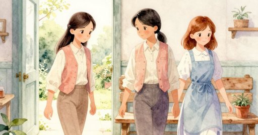 她走向高窗旁的攀緣藤株,植物盤在裂釉陶盆裡,枝條繞在細線上,衣袖掠過時輕顫。寬石窗台上放著陶製澆水壺,旁邊堆著捲曲舊蠟屑。她傾壺,小水流尚未碰土就先滴下,在乾土上暈開深色斑點。暖琥珀光穿過附在單片葉緣的小水珠。一珠滑落,留下缺口,露出昔日長葉的傷痕。那精準空白彷彿讓周遭綠葉更鮮明,每條新卷鬚因缺席而顯眼。她的手停在半空,正好複製她先前沒能刻出的線條弧度。