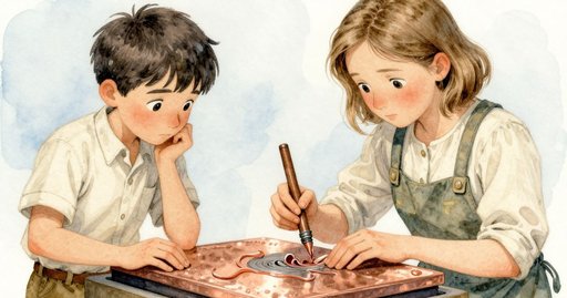 葛雷姆抱起版子,沿著筆直如巷道的走線走向玻璃隔屏;兩側桌與壓印機排成整齊街屋。瑞恩跟了幾步,在壓印機與牆間的狹處停下,那窄度剛好容她肩寬。透過透明屏,她看酸液開始均勻「噬咬」裸露銅面。漸暗的線條向外蔓延,未觸及的矩形卻保持亮度,像地圖中的靜默。上方梁木遠遠退去,她的視線再度落回那不動的小方格。沖洗完成後,版子返還,平躺潔淨,溝槽細而肯定。