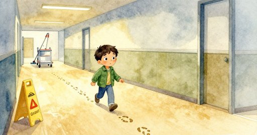 By the time Grey reached the clinic lobby, faint specks had dried into soft footprints beside the form desk. Honey-tinted light from a high window slid across them, outlining each toe mark like warm brushstrokes on linoleum. A recorded narrator from the hygiene screen above the reception desk listed hand-washing steps in a calm rhythm. The announcement had been recorded years earlier, yet the voice carried a newly polished sheen while the buzz of fluorescent tubes filled the spaces between words. Grey paused, letting the scene settle, and tried to savor the brief stillness before joining the queue. Plastic numbers lay in a shallow tray, but the next ticket had jammed beneath the others, leaving only half its corner exposed.