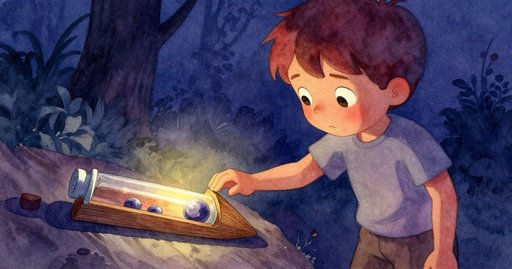 3.維拉輕放彈珠,玻璃球反射微光,展現實驗細節,場景寧靜,透露期待與靜謐感。