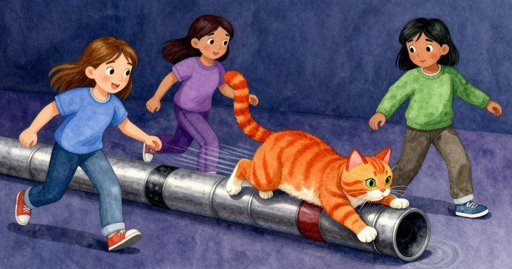 The paperback cover felt slick beneath Pearl’s palm, yet a faint grit prickled across its glossy surface like sand. She slid the cover under a cardboard tube, and glare from the table lamp bounced along the ramp in a stripe. Beside her, Vera tipped a handful of spare marbles into the launch shelf bowl, each bead flashing under the glow. Their first test run began, yet the marble slowed at a shallow turn where two tubes met, jostle sounds fading into silence. Pearl gave the joint a gentle tug, aligning the tape, and the next descent reached the book-and-block platform with livelier rattle. An adult at the supply pile cut new tubes; the steel edges caught back-lit glare like thin lightning. From that high vantage point on the couch, the adult watched quietly, leaving the girls to their slow calibration.